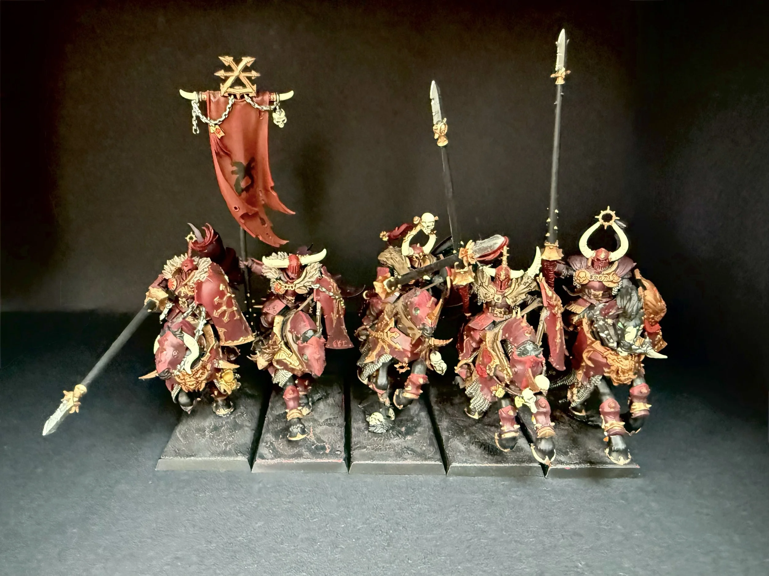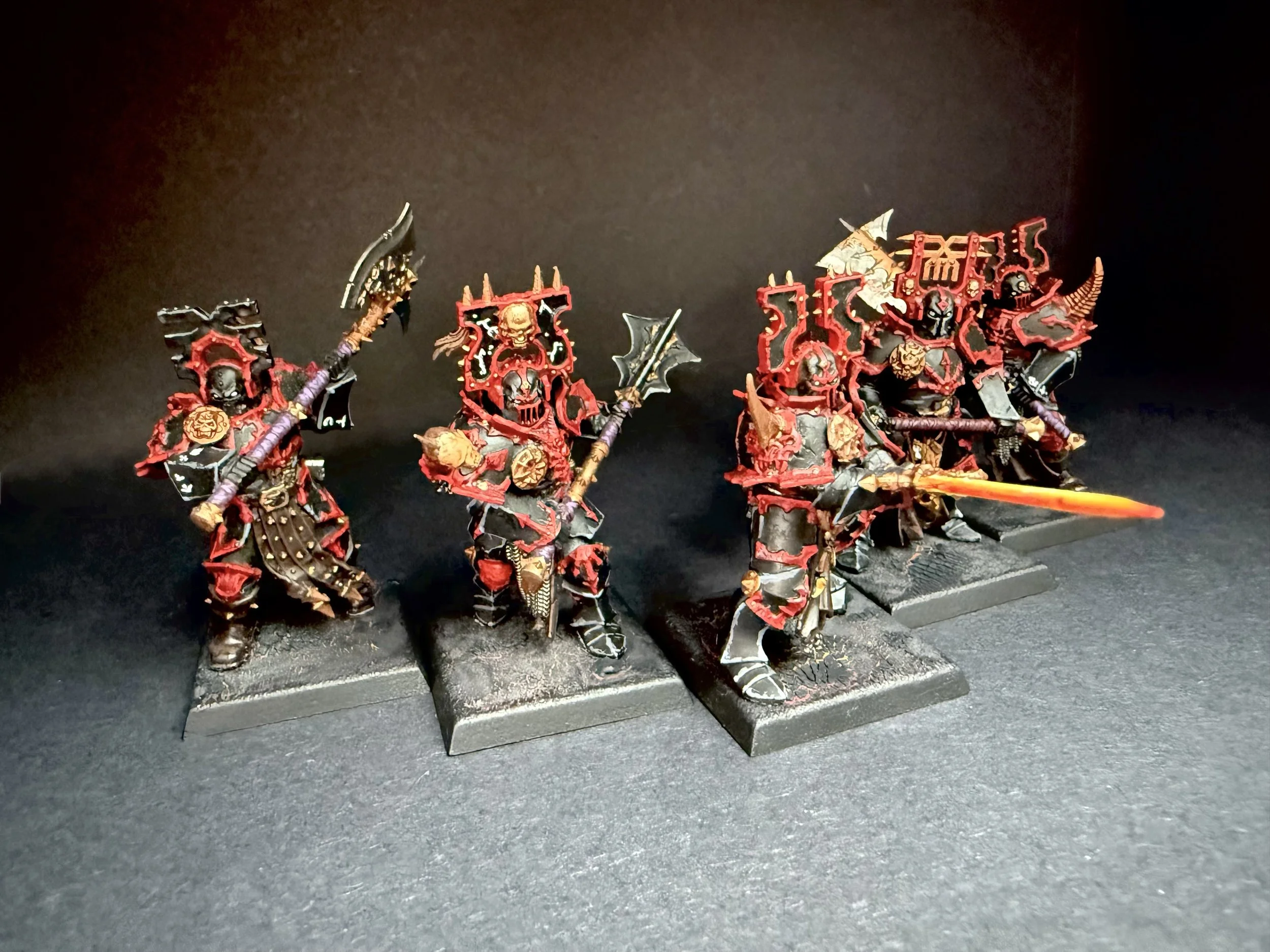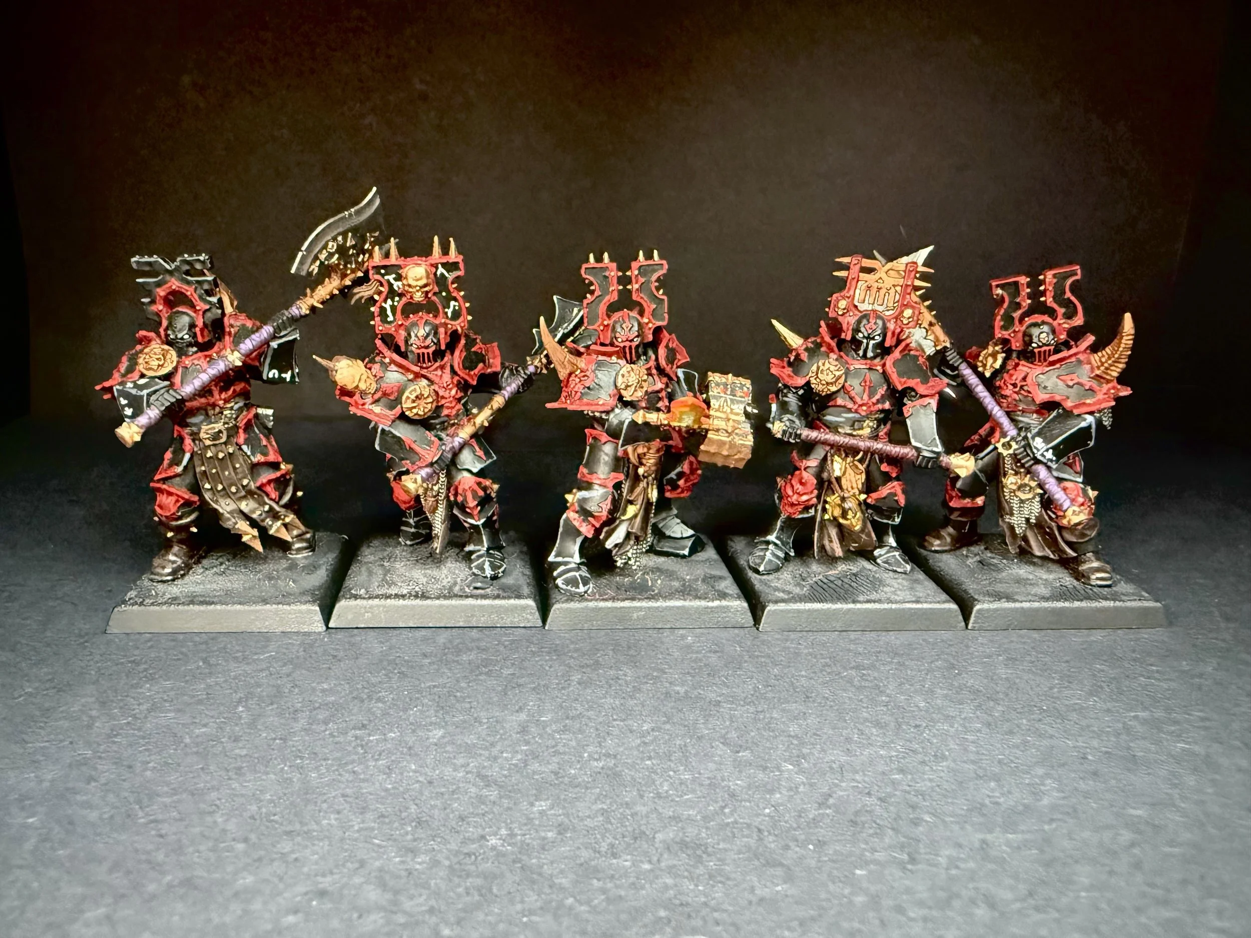 These five miniatures are my most recent project and the one Iām most proud of. These soldiers are supposed to be unique champions in their own right and to represent this I tried to give each of them something unique wherever possible such as glowing runes, the black mace instead of a regular metallic, the glowing hot sword and so on.