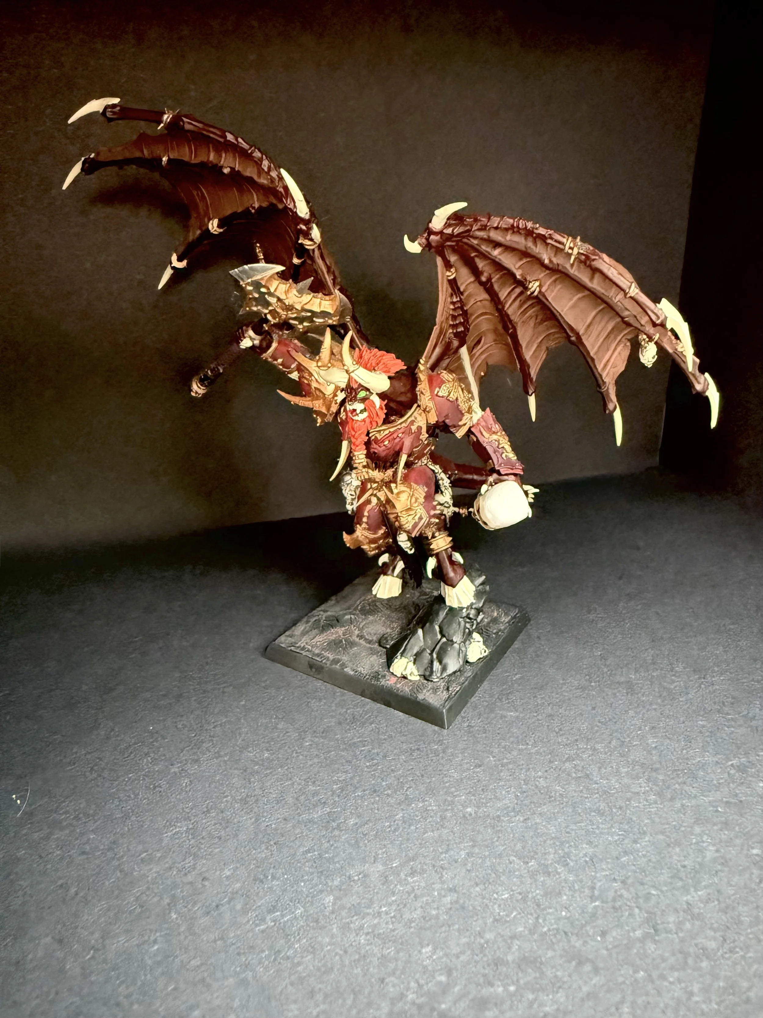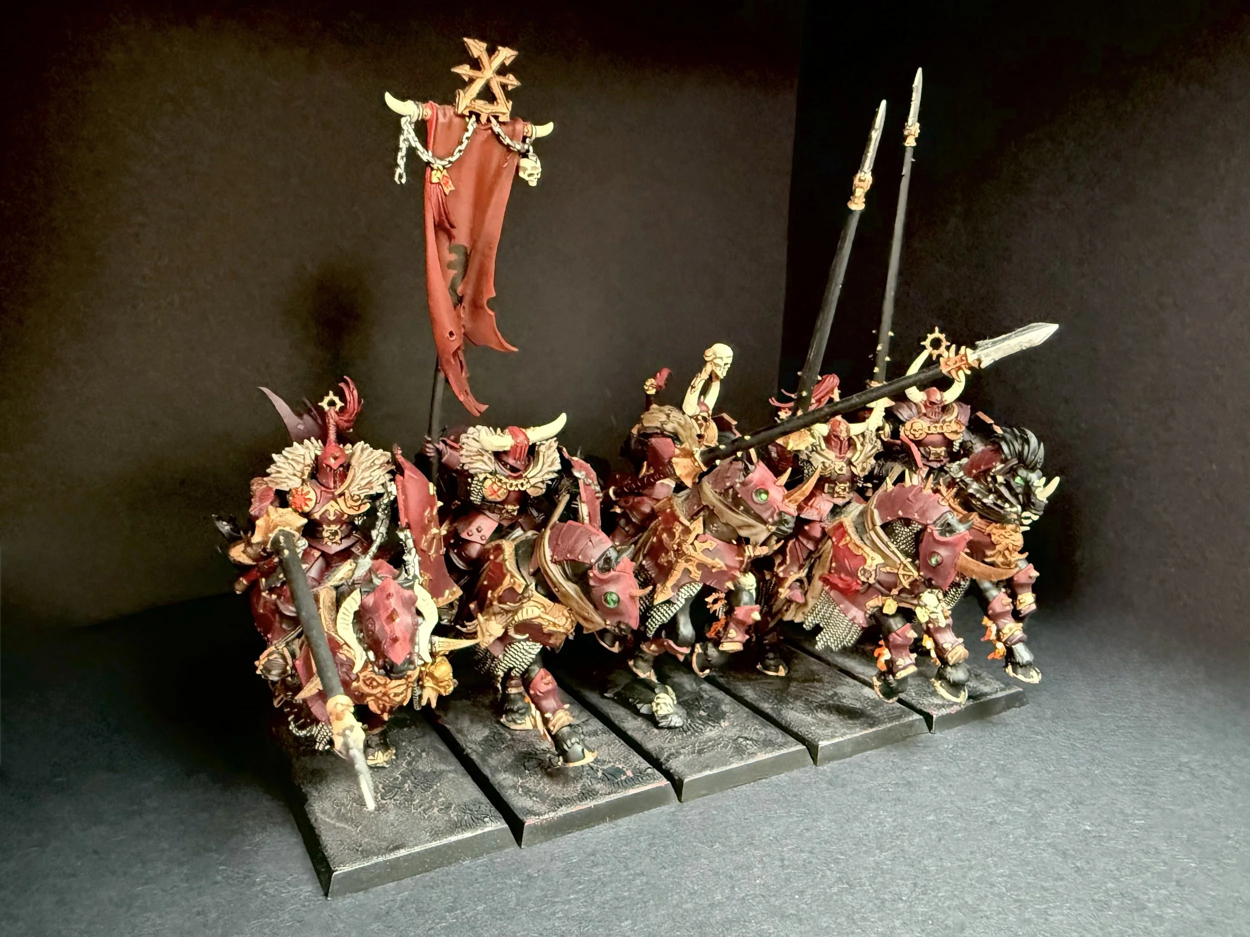 This character is the leader of my Warriors of Chaos army and as such needed to both stand out and hold up under the closest scrutiny while also clearly belonging to army. I achieved this by transferring many of the same armour painting techniques as the rest of the army onto the model while going the extra mile in highlights and details(including the addition of an extra giant skull in the princes left hand).