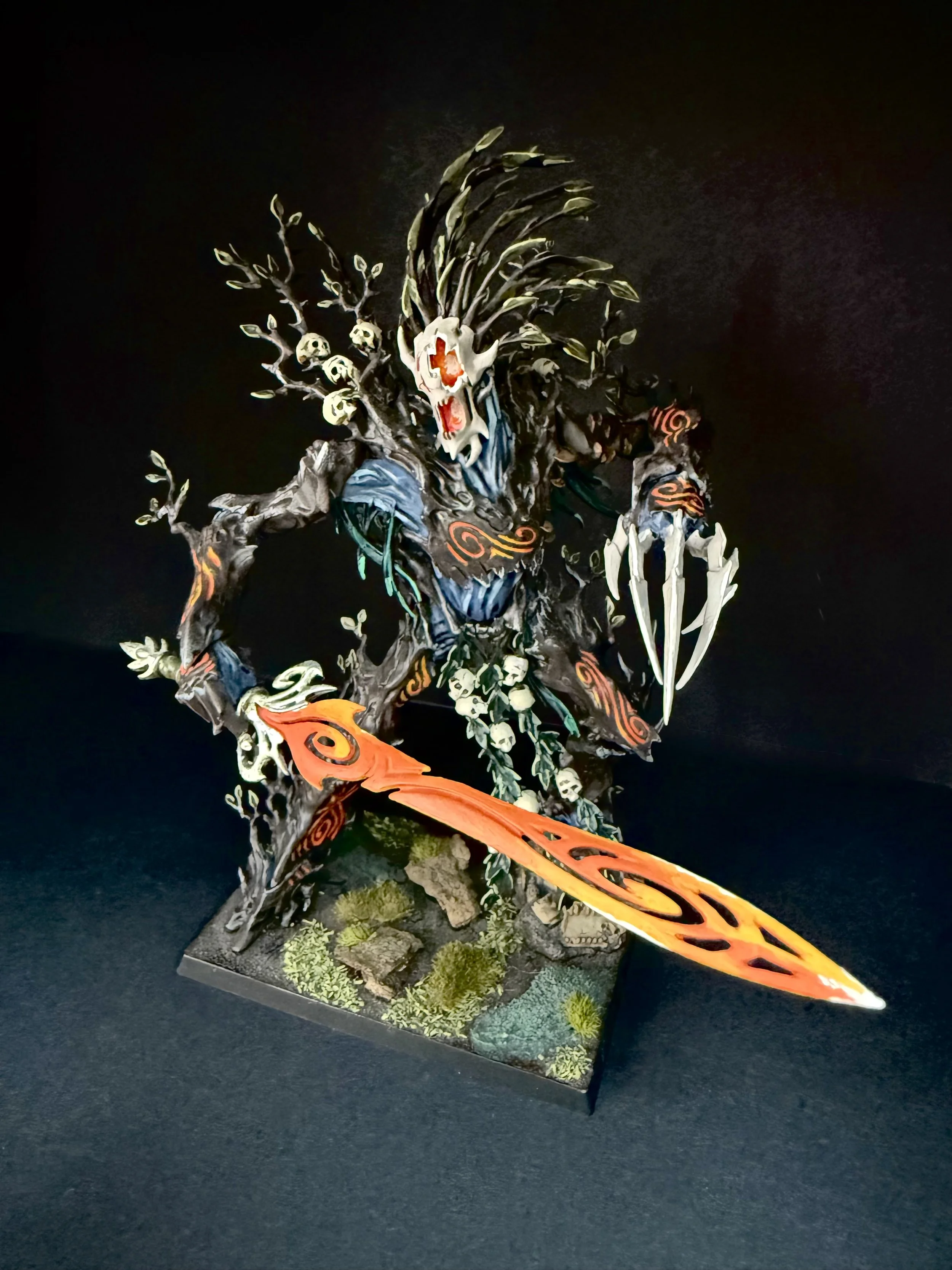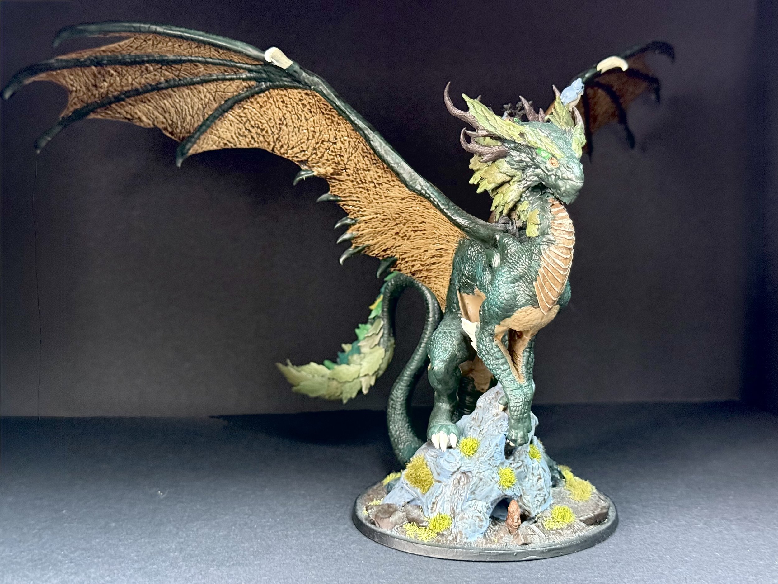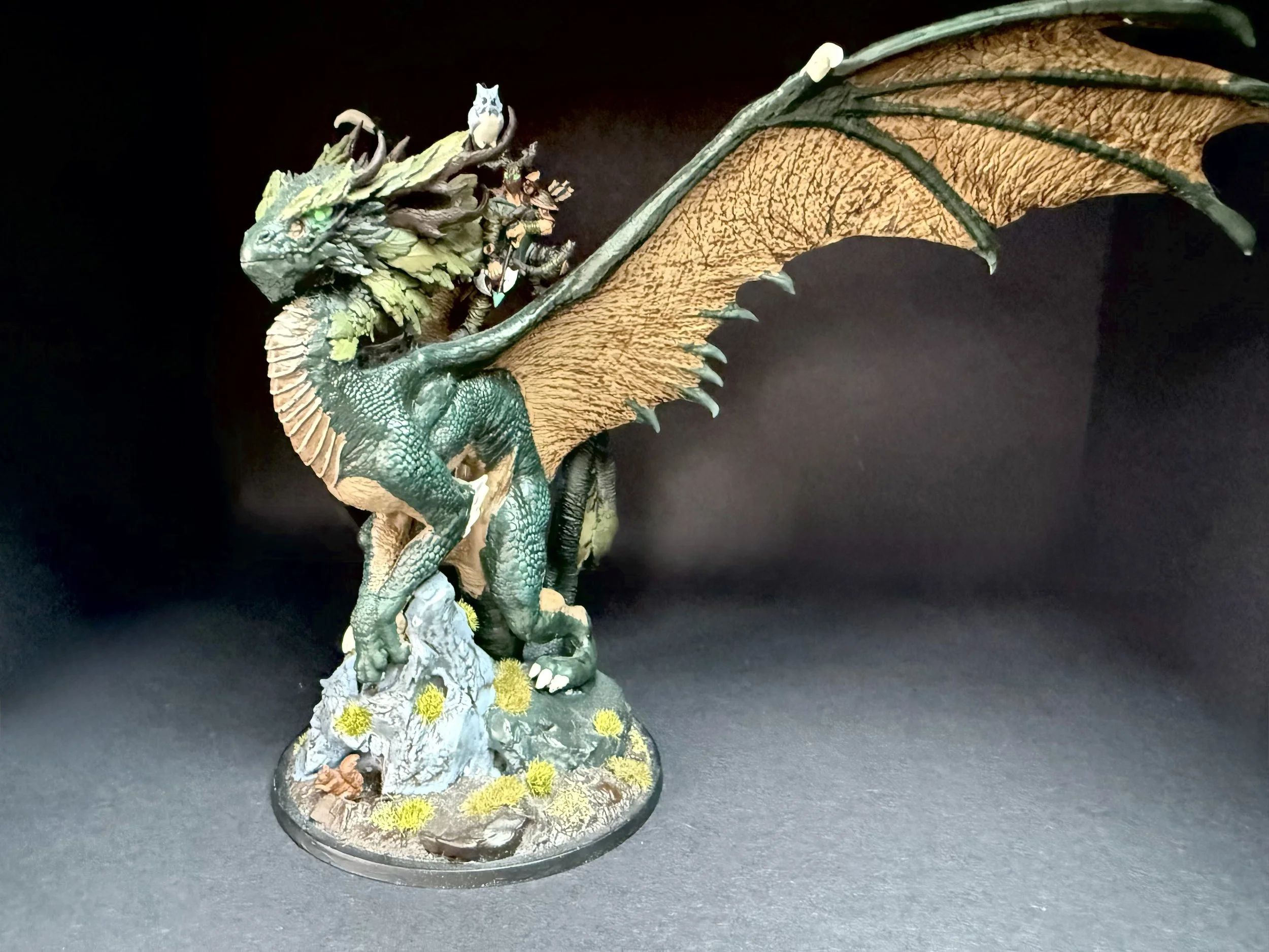 This is mini is the combination of two third party models to create the leader of my Wood Elf army. I spent a lot of time picking out colours for this model as although I knew I wanted it to be mostly green, determining which shades for each section of the dragon was important. I ended up choosing a dark green for the scales with accents of a turquoise for some visual variations and sticking to several shades of of lighter green for the leaves to make them stand out from the scales.