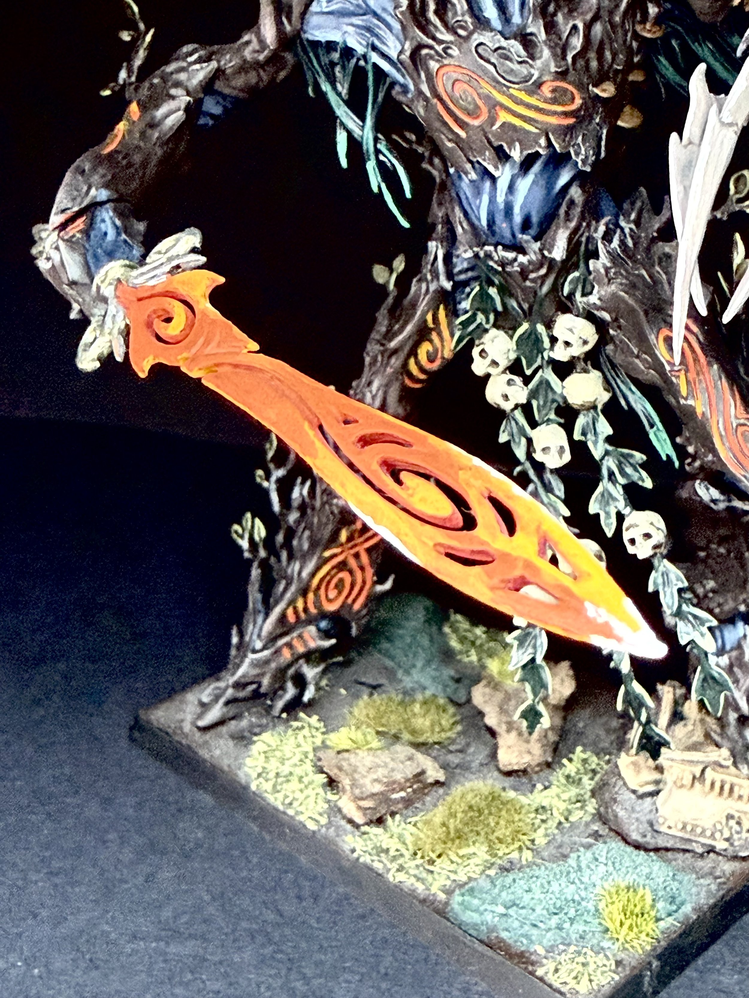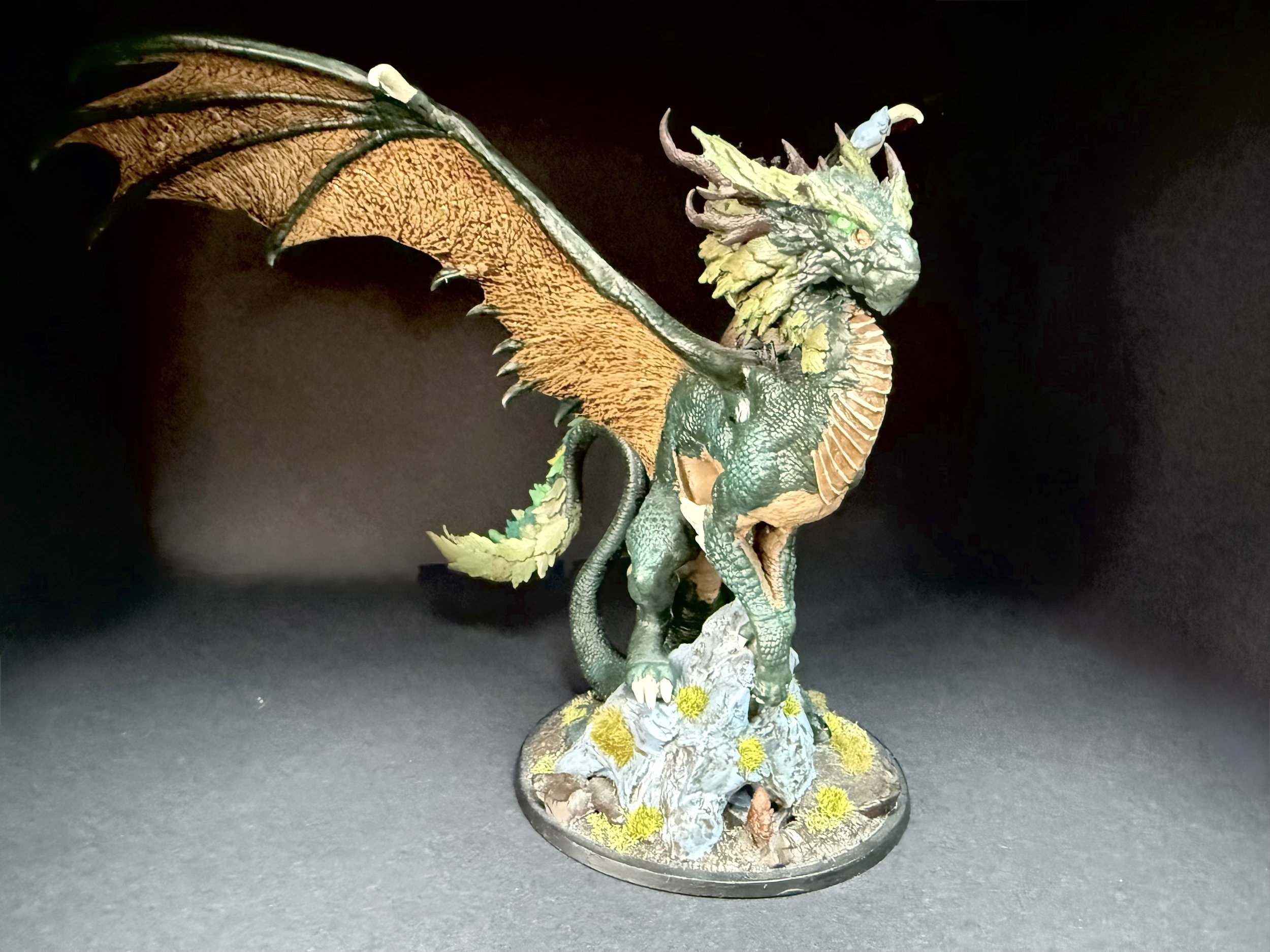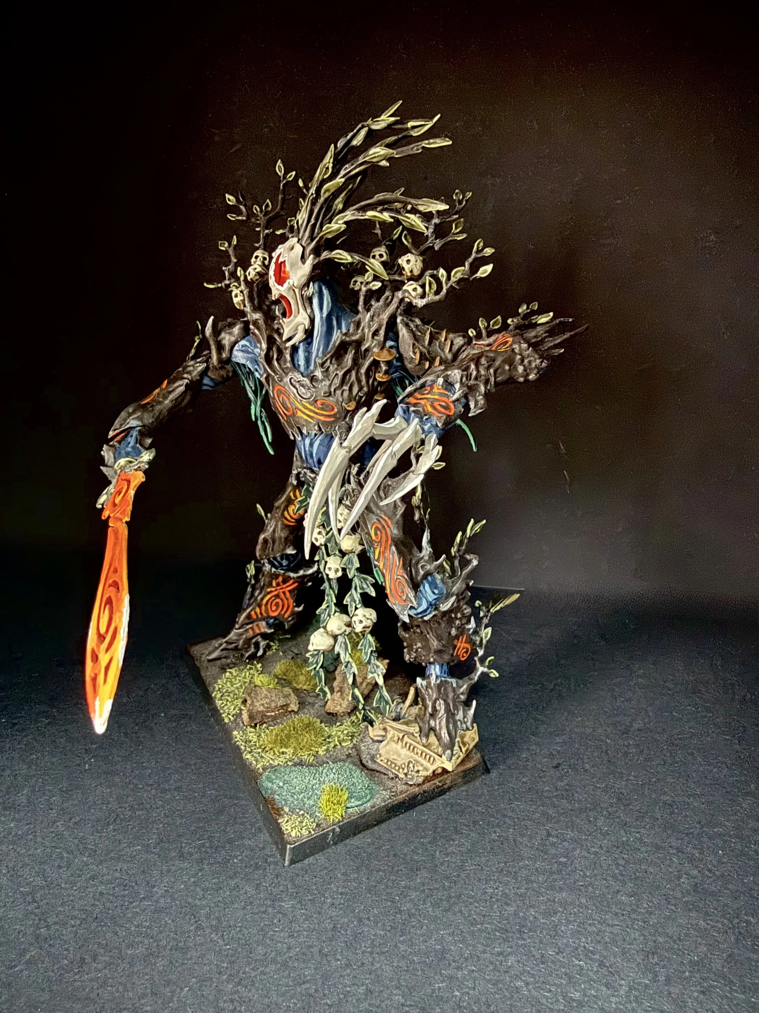 This is mini is the combination of two third party models to create the leader of my Wood Elf army. I spent a lot of time picking out colours for this model as although I knew I wanted it to be mostly green, determining which shades for each section of the dragon was important. I ended up choosing a dark green for the scales with accents of a turquoise for some visual variations and sticking to several shades of of lighter green for the leaves to make them stand out from the scales.
